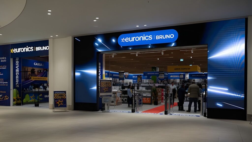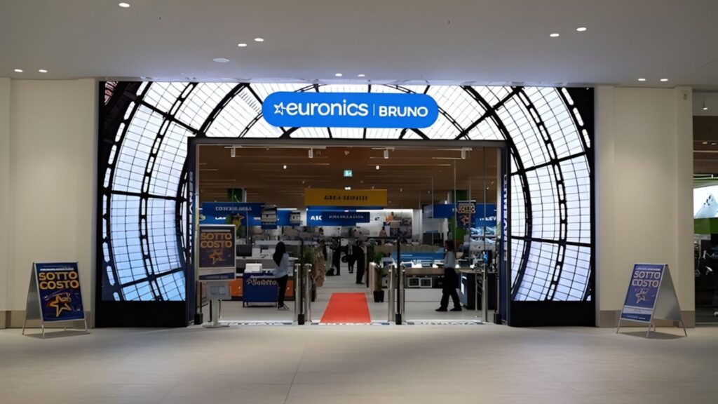 The project developed for Euronics at the Merlata Bloom shopping center in Milan is an integrated digital communication installation that combines technology, design, and functionality. Delivered by Macropix, the project involved creating a high-impact Digital LED portal at the store entrance, designed to enhance brand identity and improve the visitor experience through high-resolution dynamic content.