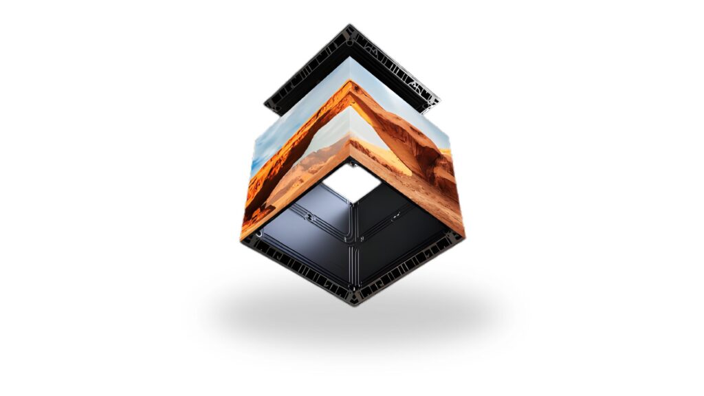 The Euronics project utilized the MOBILIS-FT series, a next-generation indoor LED solution designed to offer maximum flexibility, superior visual performance, and total architectural integration. MOBILIS-FT stands out for its ultra-slim design, with an overall thickness of just 33 mm and 30 mm cabinets, ideal for applications where space is critical. The system’s modularity allows different formats (1000×500 mm, 1000×250 mm, 500×500 mm, and 500×250 mm) to be freely combined for customized configurations and creative shapes, such as digital portals, curved walls, or 90° corner structures. Thanks to cable-free connections and panel rotation capability, MOBILIS-FT offers nearly unlimited design freedom, enabling installations with sharp angles and perfect visual continuity. The lightweight design at 18 kg/m² facilitates mounting on walls, suspended structures, or floors, making it suitable even for complex retail environments or architecturally constrained spaces.